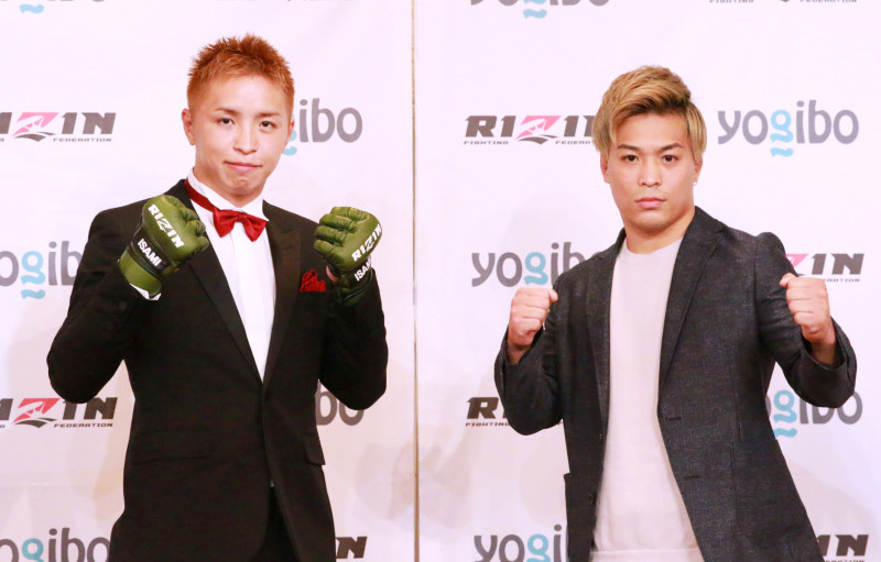 カード発表会見でオープンフィンガーグローブの久保優太(左)と太田忍(右)