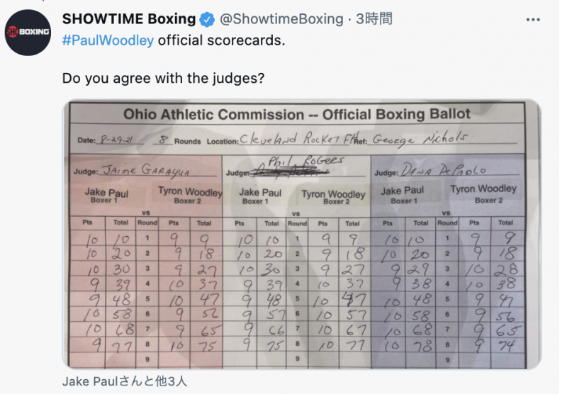 ジェイクとウッドリーのスコアカード(@ShowtimeBoxingより)