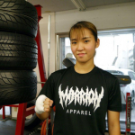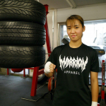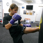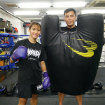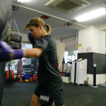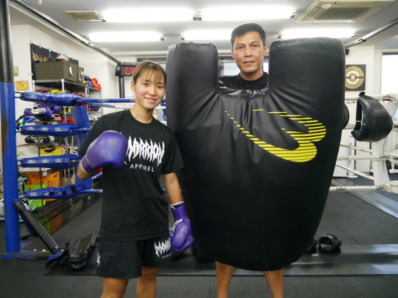 宮﨑小雪(左)が公開練習、トレーナーの体をすっかり覆うほどのビッグミット(右)にパンチやキックを連打した