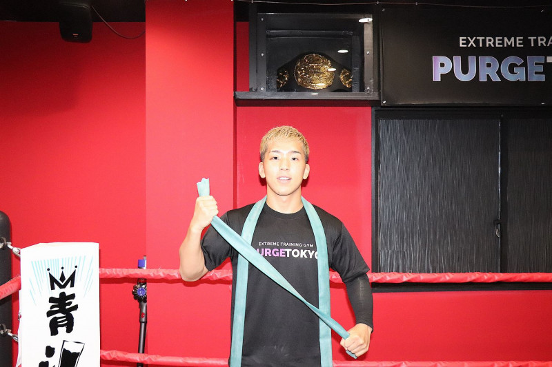 小嶋瑠久がゴムチューブを使った練習を公開。後ろにK-1ウェルター級のレプリカベルト (C)K-1