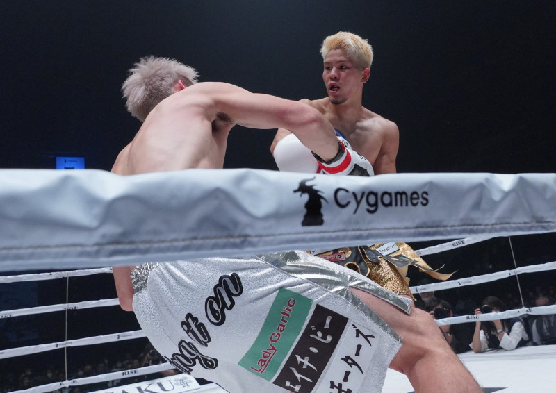 原口の右フックが相手を捉え崩れ落ちる瞬間