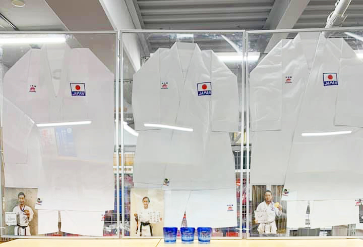 右から金の喜友名諒、銀の清水希容、銅の荒賀龍太郎の展示された道衣
