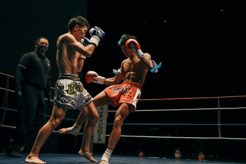 ローからヒジのコンビネーションを得意とする松本(右)の右ロー