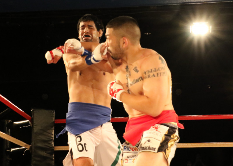 ラウェイルールでパンチを放つ渡慶次(手前/2021年7月)