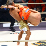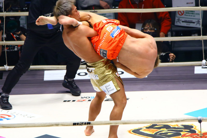 腕十字を仕掛ける所英男を持ち上げる太田(左)、そしてマットに叩きつけた