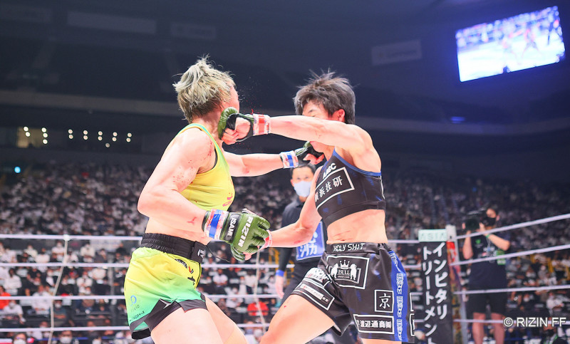 激しい打撃戦、互いのパンチが顔にヒット