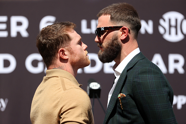 会見の冒頭で睨み合う両者、乱闘はここから始まった(Getty)