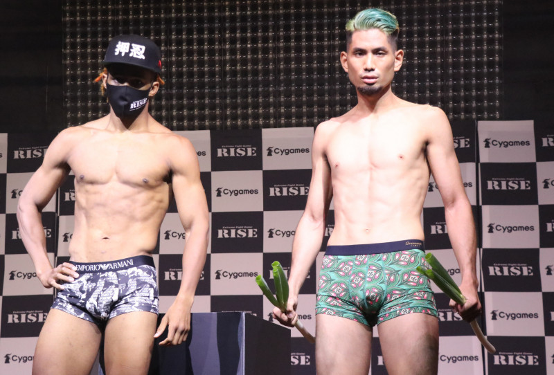 ”押忍”キャップを被るベイノア(左)と両手にネギを持つねぎ魔神
