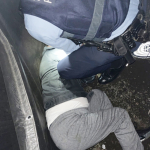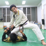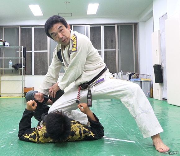 シビサイが泥棒を制圧したニーオンザベリー。膝を相手の体の中心に置き体重を乗せる(実演はシビサイの師・中井祐樹氏)