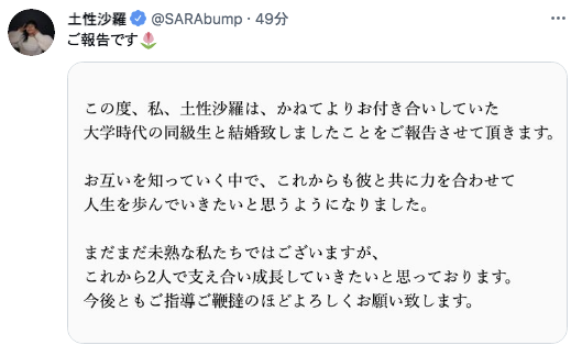結婚を報告した全文(土性沙羅Twitterより)
