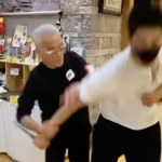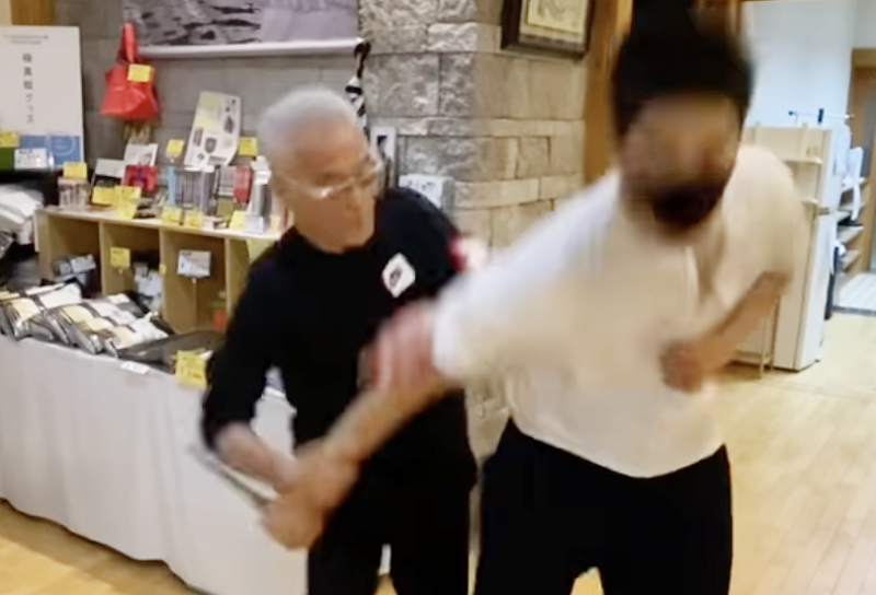 短刀取りで73歳とは思えない素早い動きをみせた盧山初雄(極真館Facebookより)
