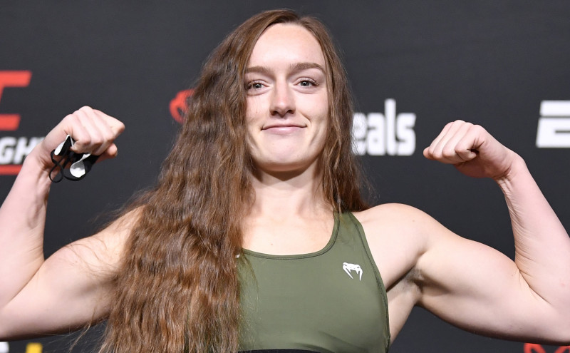 長髪美女戦士・アスペン・ラッドがムキムキマッスルポーズで計量パス(©Getty Images/UFC)