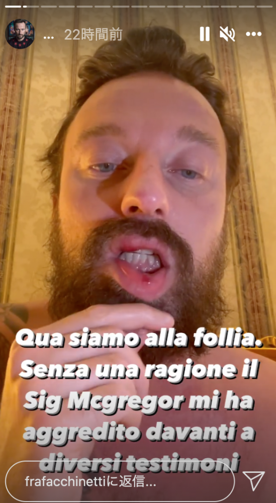 マクレガーに殴られた負傷したと主張する下唇を見せるファッキネッテイ氏@frafacchinettiより