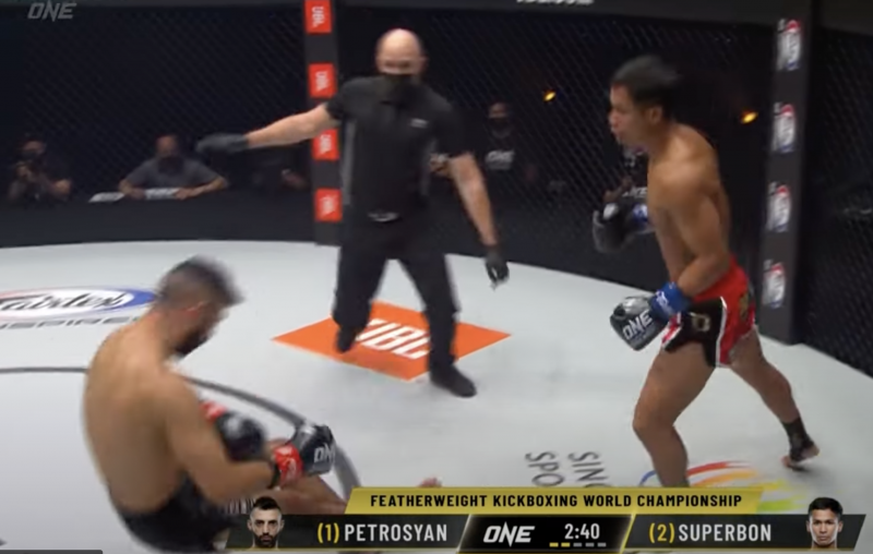 3.ペトロシアンが失神し倒れる瞬間(失神KO負けを喫したペトロシアン(ONE公式youTubeチャンネル映像サムネイルより)