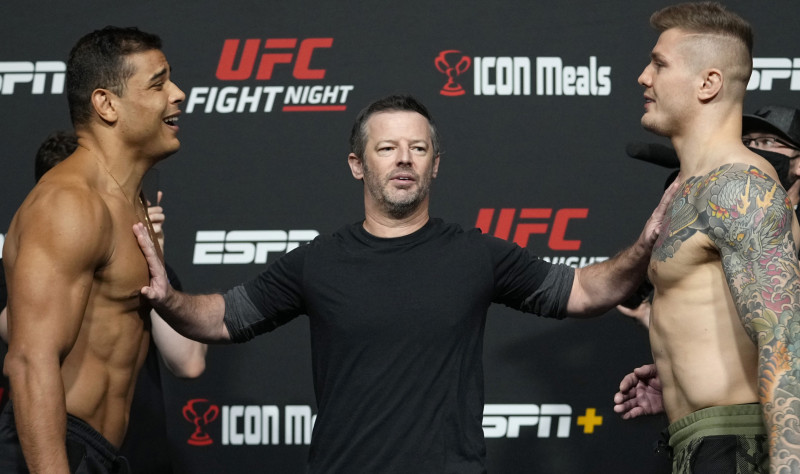悪びれもせず薄ら笑いのコスタ(左)激怒の表情のヴェットーリ(右)(©Getty Images/UFC)