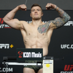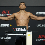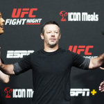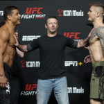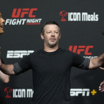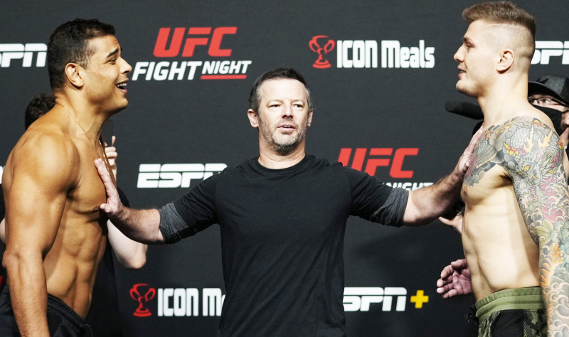 悪びれもせず薄ら笑いのコスタ(左)怒りの表情のヴェットーリ(右)(©Getty Images/UFC)