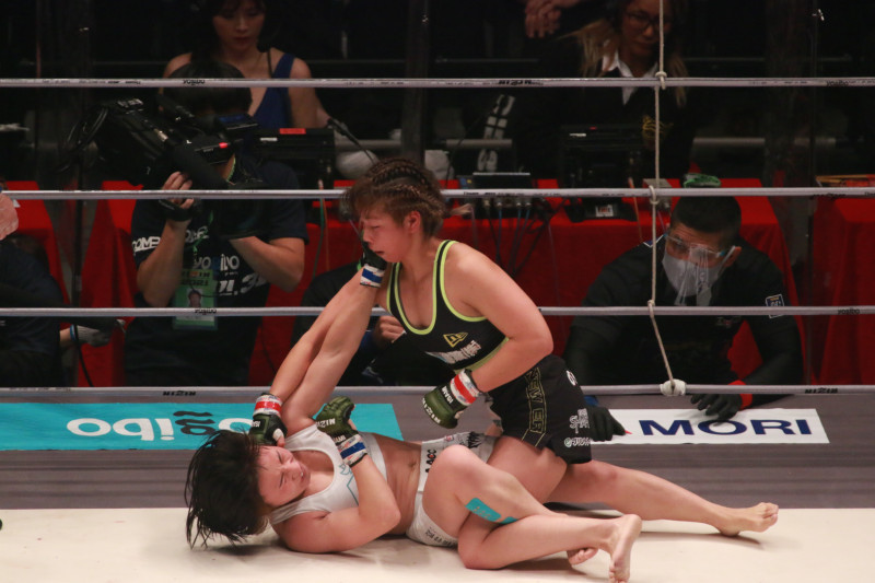 大島の上になり、パウンドを落とす浅倉