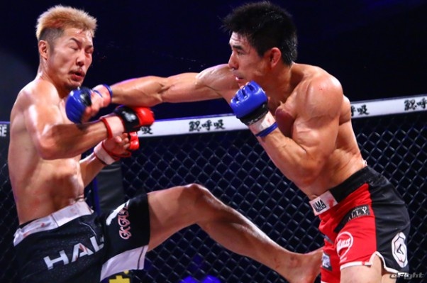 徳留(左)に強烈な右ロングフックをクリーンヒットさせる久米。最後はパウンドでTKOし王座奪取した(16年9月)