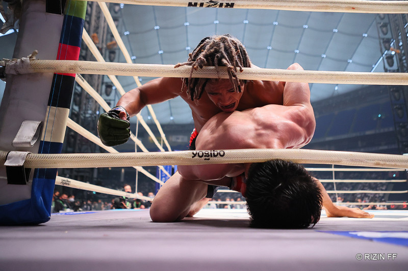今年6月のMMAデビュー戦、弥益の上になり鬼気迫る顔でパンチを放つベイノア