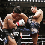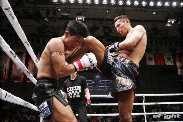 相手の顔に強烈な膝蹴りをヒットさせる中島