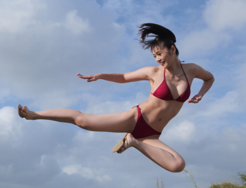 美女空手家、長野じゅりあがビキニ姿でライダーキック