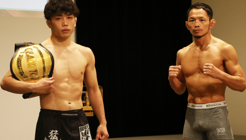 激突する宇野薫(左)とGLADIATORフェザー級王者原口央(左)