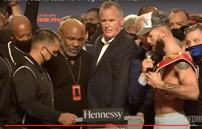 マイクタイソンが両者の舌戦の間に登場した(SHOWTIME Sports YouTubeより)