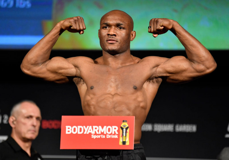 マッスルポーズで計量パスする王者ウスマン©️UFC