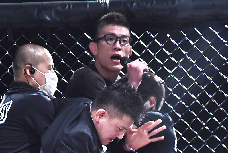 スタッフに抱えられながら吠える青木真也