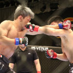 強烈フックをクリーンヒットさせ、TKO勝利する小見川(右)=19年前戦