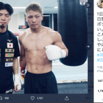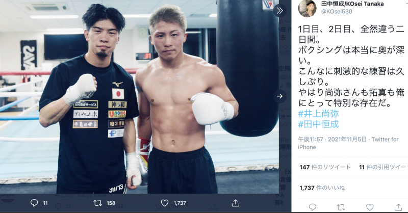 田中はSNSで井上とのスパーを報告。「1日目、2日目、全然違う二日間。ボクシングは本当に奥が深い。こんなに刺激的な練習は久しぶり」と綴っていた(田中恒成Twitterより)