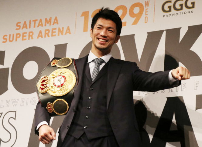 ゴロフキン戦の発表記者会見で笑顔を見せた村田