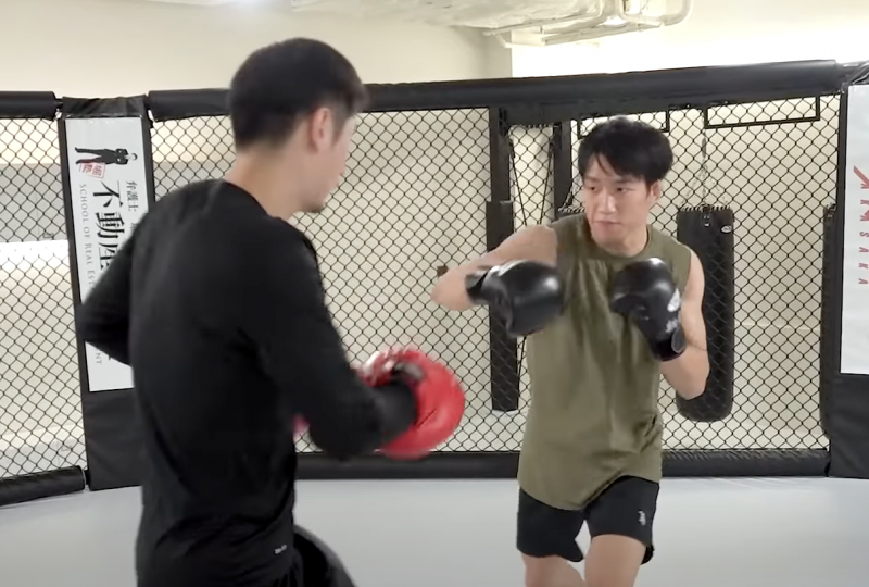 拳完治でミットを打つ朝倉(朝倉海YouTubeチャンネルより)