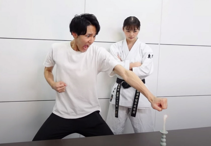 長野じゅりあ(右)が超人気TikTokerのISSEIにロウソク消しを指南した(じゅりあの黒帯天使ちゃんねるより)