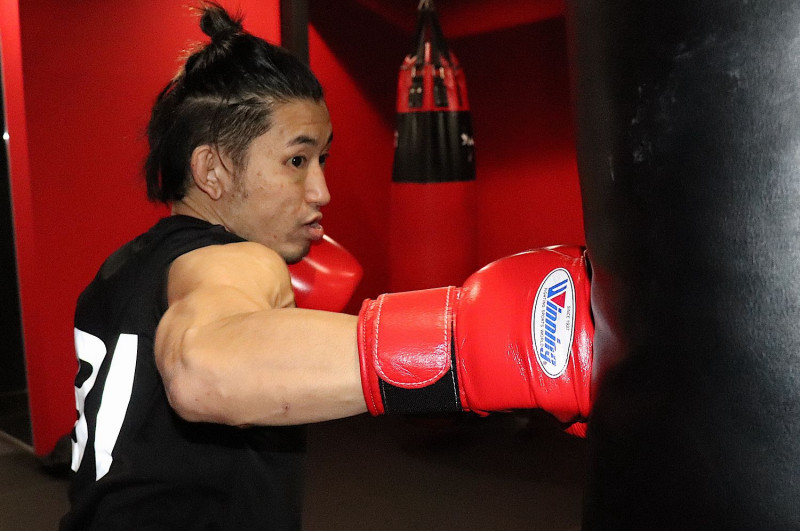 サンドバッグに重いフックを打ち込む才賀(C)K-1