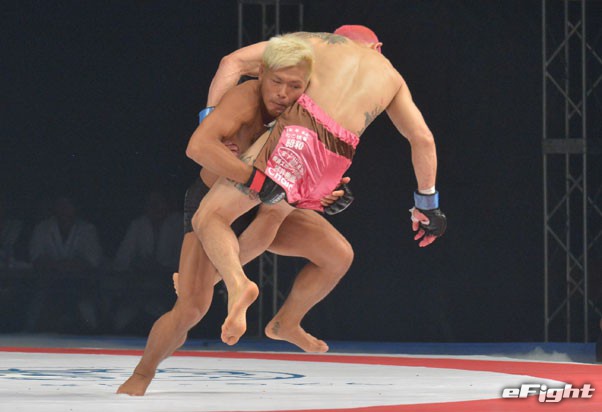強烈なタックルを決める奥田=18年・巌流島・全日本武術選手権