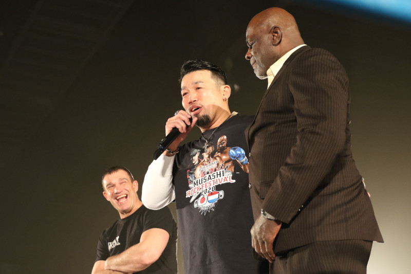 2020年大会のオープニング挨拶、盟友アーツ(左)とホースト(右)に囲まれた武蔵