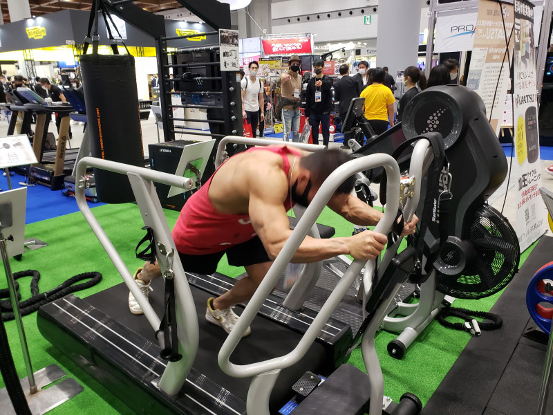 そりプッシュトレーニングはTHINKフィットネスのブースにある『sledmill』というマシンで体験できる。実演はゴールドジムの店員さん