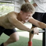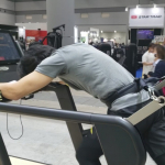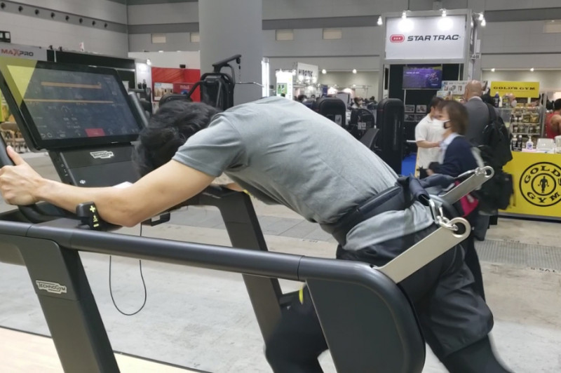 タイヤ引きに近いパラシュートトレーニングを擬似体験できるルームランナー『TECHNOGYM』のブース。実演は店員さん