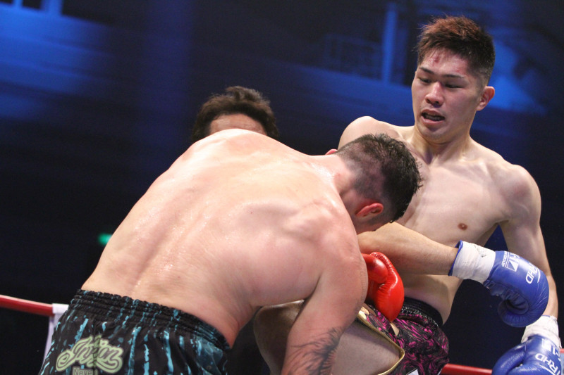 ボディを効かされ、和島にもたれかかるように体勢を崩す木村