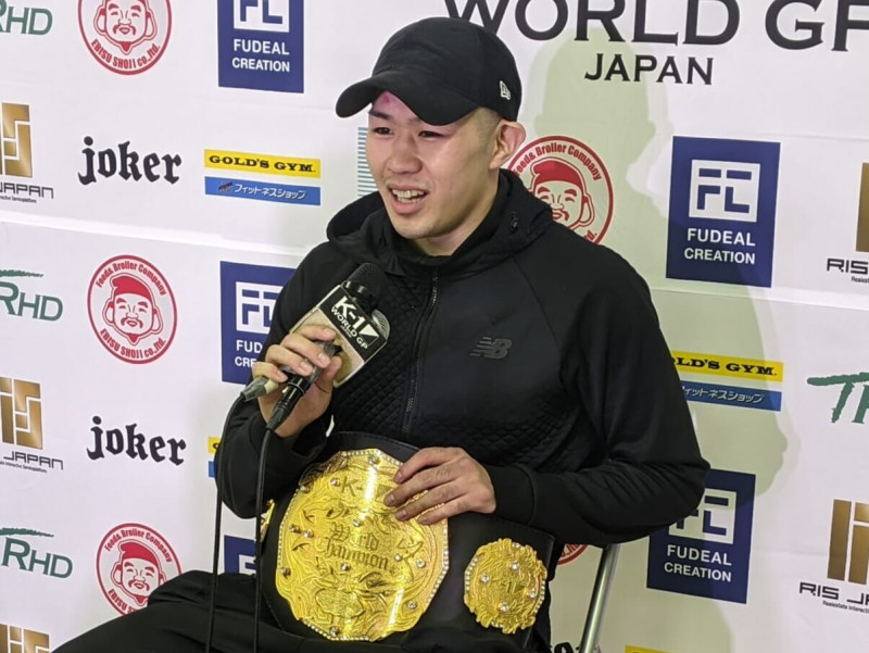 ベルトを巻き笑顔でインタビューに応じる和島