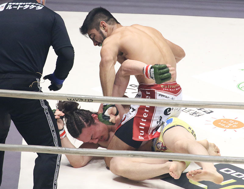止まらないパウンドで矢地にTKO勝利するサトシ=昨年8月