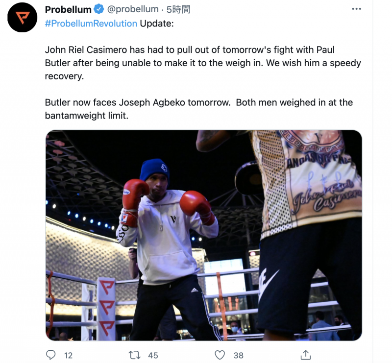 カシメロ戦中止を告知するプロモーターのTwitter(@probellum)