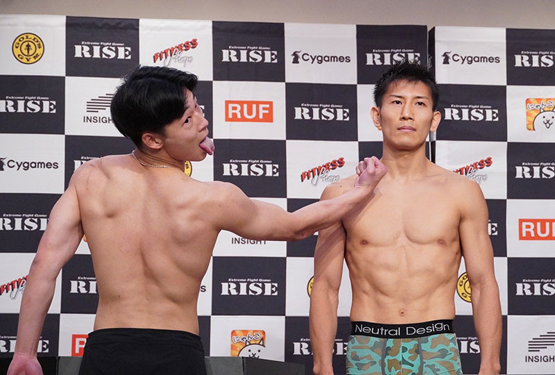 秀樹(右)の顔に拳を突き上げて挑発するウザ強