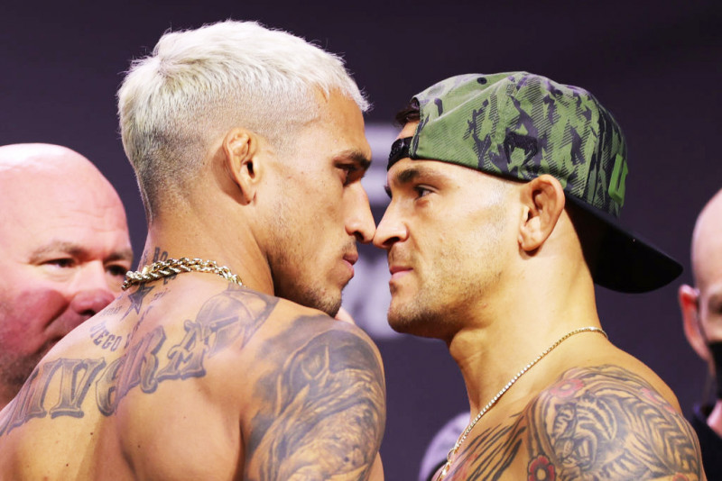 激突する、王者オリベイラ(左)と挑戦者ポイエー(右)@UFCより