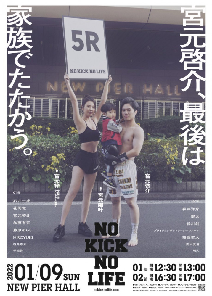 NO KICK NO LIFE1月大会のポスターは、今大会で引退する宮元啓介の家族写真が掲載された