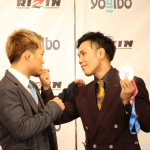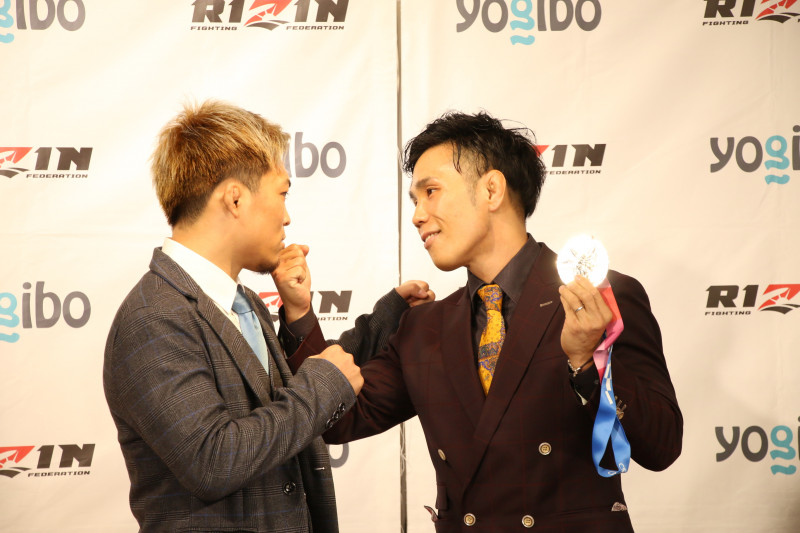祖根(右)がAmazonで買ったという銀メダルを手にしながら、太田にパンチのポーズをしてみせる