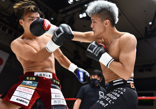 前戦、右フックでKO勝利する村田