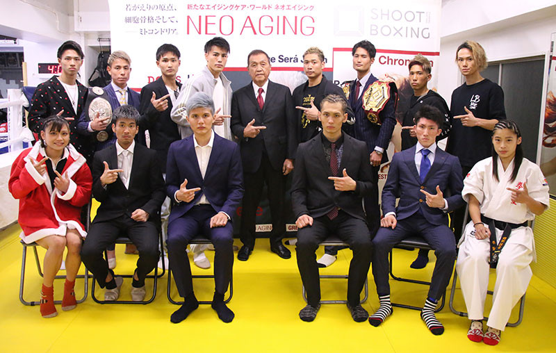 明日の試合に出場する選手たちと、シーザー会長(中央)