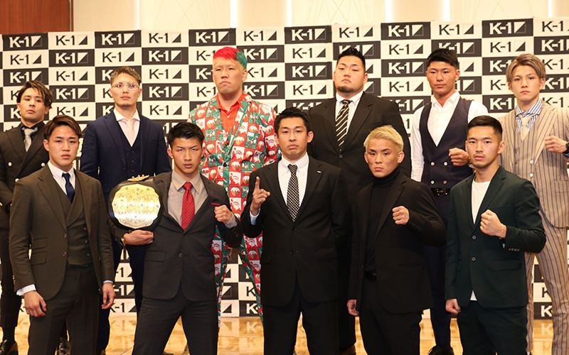 カード発表会見に出席した選手たちと、K-1中村プロデューサー(中央)